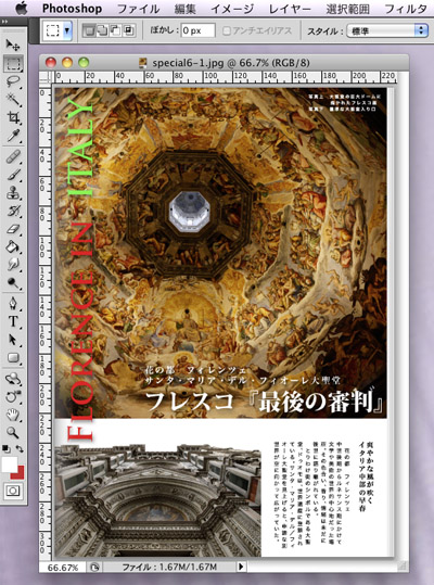 写真の合成から、雑誌ページ作り、ポスター作りまでなんでも このように、photoshopというソフトは、工夫次第で何でもできる魔法のソフトウェアです。下の画像をみてください。こちらはphotoshipを使って、雑誌の1ページを作成してみました。もちろん複数ページになった場合には、ページの管理などもあるため、Adobe Indesign がよいでしょう。でもこのように2〜3枚のページであれば、photoshopでも作る事が可能です。