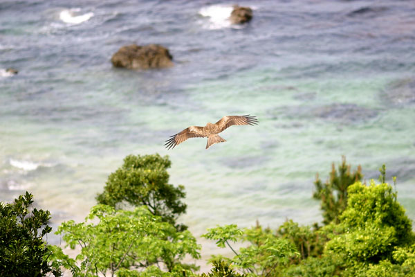 海に向かって飛び去っていく。海から吹く向かい風に逆らわず、風を利用して高く高く舞い上がる。海の色も透明感がありまるでハワイの海のようだ。ここは伊勢志摩の海だ。