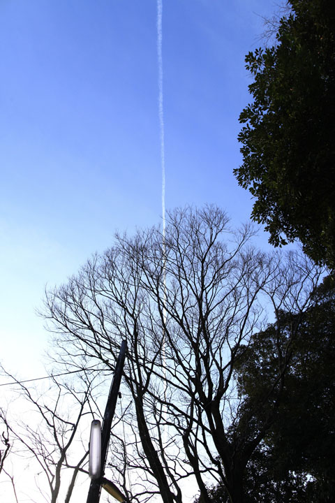 まっすぐ伸びる飛行機雲。神社の境内を散策し、空を見上げると、遠くの空に見えた。季節は春の入口。木々はすこしづつ春を迎える準備をしはじめていた。境内の中はこころなしか張りつめた清らかな空気に包まれ、心も引き締まる思いだ。