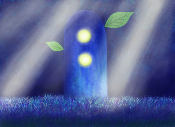 深い深い森の中は、紺色の美しい森でした。森の中央には、小さな小さなほこらがあって、その中からかすかな光が漏れてきています。小人のほこらでしょうか。