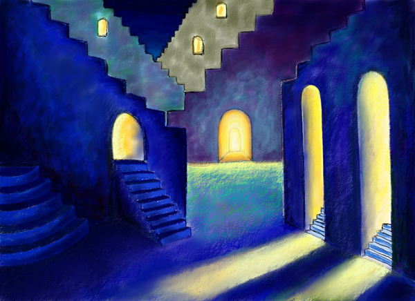 きっと遠い異国のどこかの国の街に迷い込んだに違いない。家々の屋根は階段状になっていて、どこか滑稽な感じがします。家の玄関からは金色の光が漏れ、その光が路面に広がって、光の海のようです。