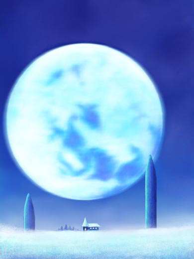 大きな蒼い月と雪をかぶった小さな家、そして青く照らされた雪原はとっても幻想的で美しい。遠くからこうして眺めていると時間を忘れ見とれてしまう。