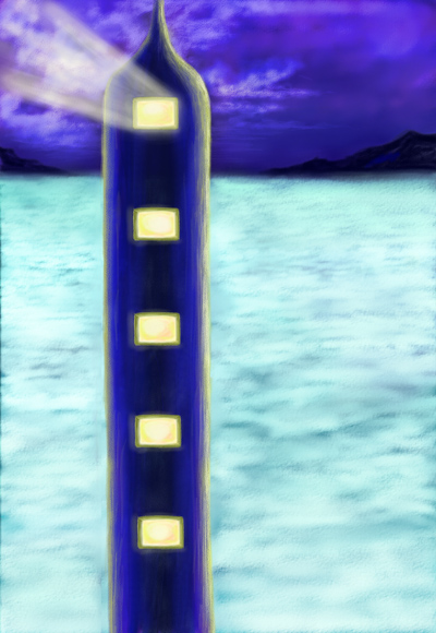 塔には大きな大きな窓が開いていて、そこから強烈な光が天空めがけて延びていきます。暗闇を案内する頼もしい光は、いつかこの海を渡ってくる船乗りたちを正しい道へと導いていく事でしょう。
