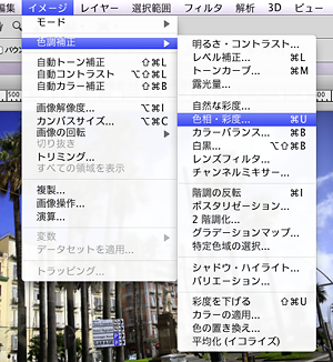 色相・彩度のメニューを選択する。この「色相・彩度」の機能は写真の補正では使用するので、覚えておくと良い。