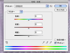 「色相」のスライダーを試しに動かしてみよう。ここで安心してもらいたい。ダイアログが開いてその中で、設定値(今回の場合「色相」のスライダーを動かすこと)を変えても、「ダイアログの中でOKを押さない限り」実は元画像に影響することはありません。