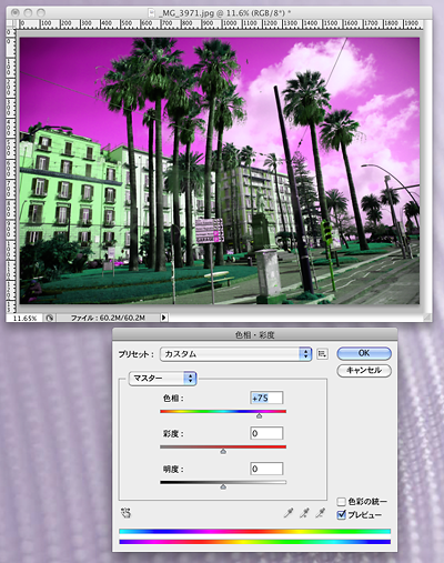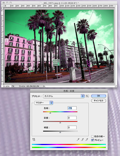 逆に色相のスライダーを逆側に設定してみました。すると今度は空は何とも言えない不気味な緑色に。建物の壁はピンク色になりました。