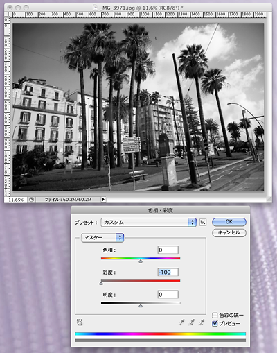 「彩度」を変更してみる! 今度は「彩度」を変更してみよう。左図のように、彩度を「−100」と設定してみた。すると図のように色味が全くなくなった。つまり色の彩度を0に設定したことになる。これはいわゆる色がない状態、つまり白黒写真と同じです。意図的に白黒の写真、画像にする事ができるわけです。