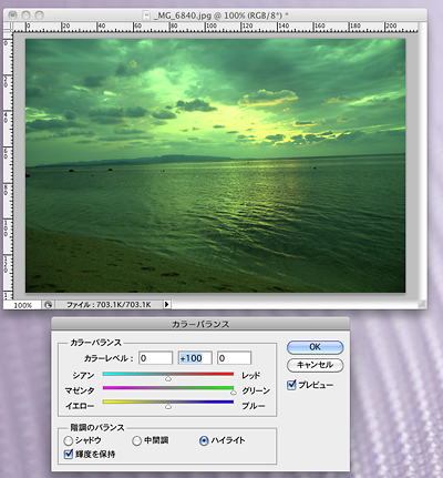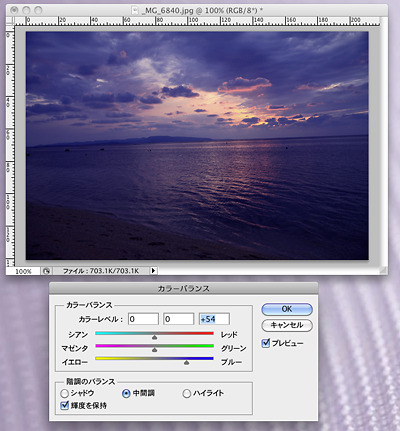 なぜ元画像が変化してしまっているのでしょうか。答えは、ダイアログの中にある「プレビュー」にチェックがついているからです。従ってあくまでOKを押すまでは、プレビューしている状態となっています。