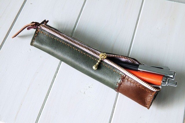 ★やわらかい手触りの2色カラーリングの本革ペンケース(モスグリーン)