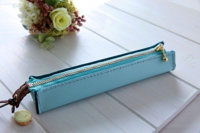 ★さわやかなスカイブルーのやわらか牛革三角型ペンケース