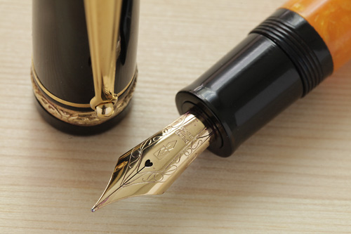 また、胴軸のデザインとして、珍しい胴が真ん中にかけて丸みを帯びているデザイン。流線型で美しく、レジンもかなり特殊なレジンが使われているそうです。ですが、この丸みが、、実は長時間筆記には向かないのです。ちょっとした筆記にはオシャレで、優美なため、ライティングジュエリーと呼ばれるだけの事はあるかと思います。