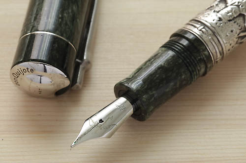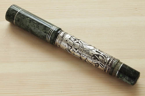 この万年筆、胴軸が純銀製である事から、想像できるように、、、、かなり重いです。正直書くための万年筆、、というよりも見て楽しむ鑑賞用万年筆といったところ。ただ軸のデザインは精巧に作られていて、深いグリーンマーブルのレジンは本当に美しい。世界限定605本