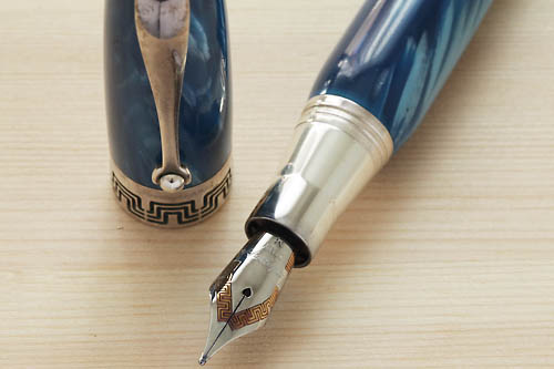 世界限定809本。深い青色の細かなマーブル柄のデザインはとても美しく、シルバーリングとの相性は抜群です。さすがイタリアデザインといったところ。18金のペン先は、デルタの他のペンと同じく、若干固めのペン先。ガリガリと仕事で書きまくっても大丈夫そうな質実剛健な作りをしています。