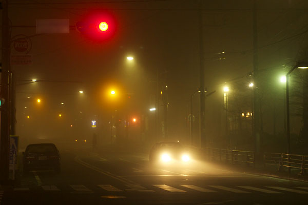 街は深い霧に包まれていた。ヘッドライトで乱反射した光が普通の街を幻想的な空間への変えていく。静かに走り去る車のテールランプの赤色が霧の中ににじんでいる姿は、まるでロンドンの町並みのようだ。深い霧は深夜すぎまで晴れる事なく、明け方まで続いていました。