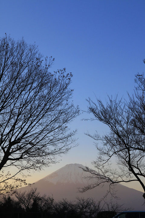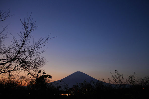 夕暮れ迫る霊峰富士山。美しいシルエットに思わずため息がでる。空がいよいよくらやみに落ちていく瞬間。巨大な山さえも、空と大地に溶け込んでいく。
