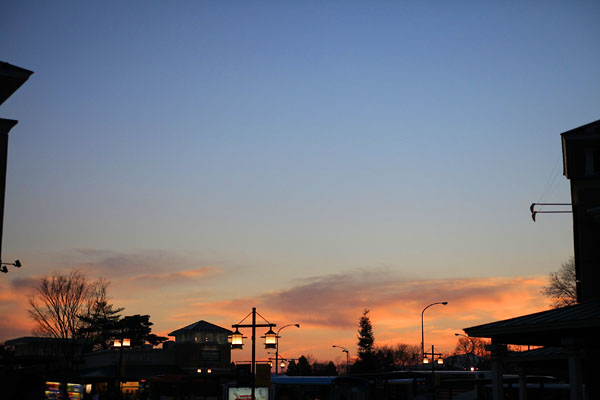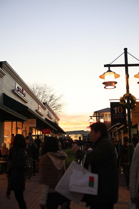 夕暮れ迫るアウトレットモール。ドラマチックに赤色に染まる空気が、何気ないショッピングモールを包み込み、世界を一変させる。思わず美しいと感じしてしまうほどだ。