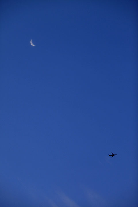 紺碧の大空に旅立っていく。三日月がやさしく見守っている。共に小さく見えるが、とても大きい。でもこうしてみてみるととてもかわいらしく、いとおしく見える。