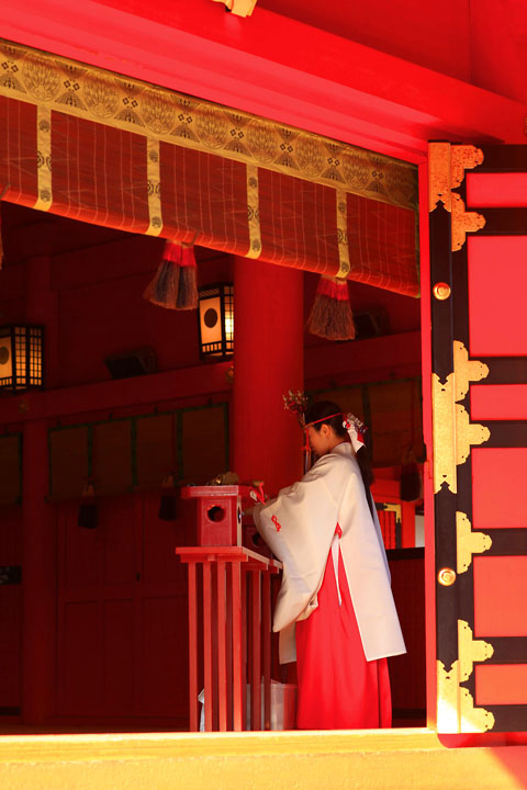 神々が宿る神殿。紅色に包まれ、特別で神聖な空気に包まれる。緋袴の赤は魔を祓い、神々の聖域を守る。常にはらい清められた空間は、不浄なものを一切寄せ付けないパワーを持つ。神に仕える人々の日々のたゆまぬ努力の賜物だ.
