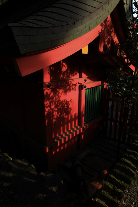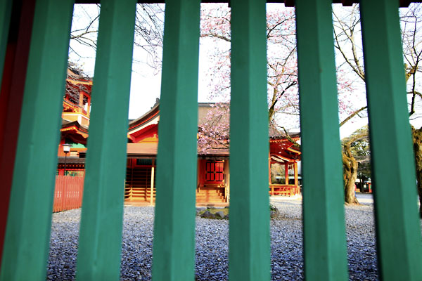 神社は意外にカラフルな色に包まれている。緋色の赤、境内の柵は、この色は何色と表現したらよいのだろうか、、暗苔緑。。だろうか。そして境内に咲く寒桜のピンク。日本の伝統色に包まれる境内は、日本の美を、四季の移り変わりを見事に実直に表している。