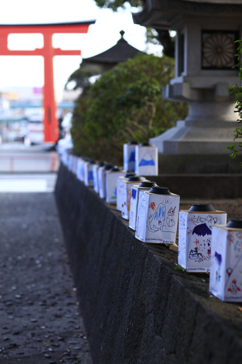 近所の小学生の作品だろうか。境内のメインストリートの両側に置かれた行灯。とってもかわいらしい。地元の人たちに親しまれて来た神社なのだろう。夕暮れ時、ともされるささやかな灯りがとても楽しみだ。