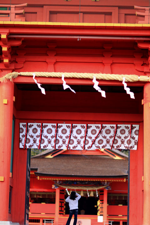 目が覚めるような緋色。しめ縄に吊るされた紙垂が風に揺れていた。紙垂は、雷光、稲妻をイメージし、邪悪なものを追い払うという。子供が興味津々でカメラを構えていた。子供の頃から節目となるイベントがあるたびに親しんできた神社という存在。人が生まれ死するときまで神社は私たちにとても身近な存在であり続ける。