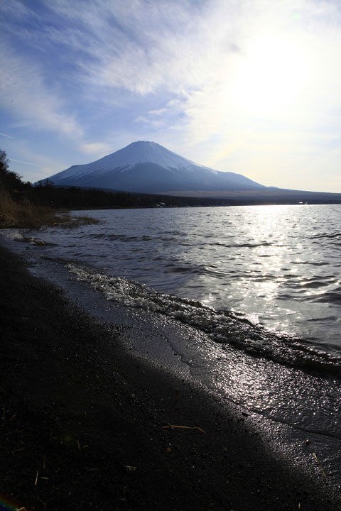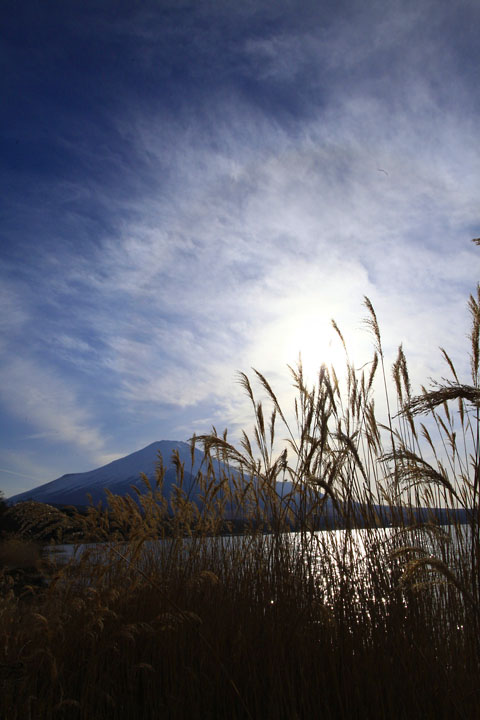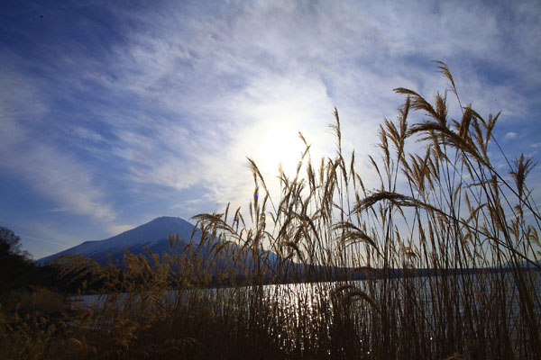 太陽の光がうす雲に反射して、空全体が光に包まれているかのように見える。青く空気の澄み切った空と富士山、そして静かな水をたたえる湖畔は、何百年も昔から人々に愛されて来たに違いない。