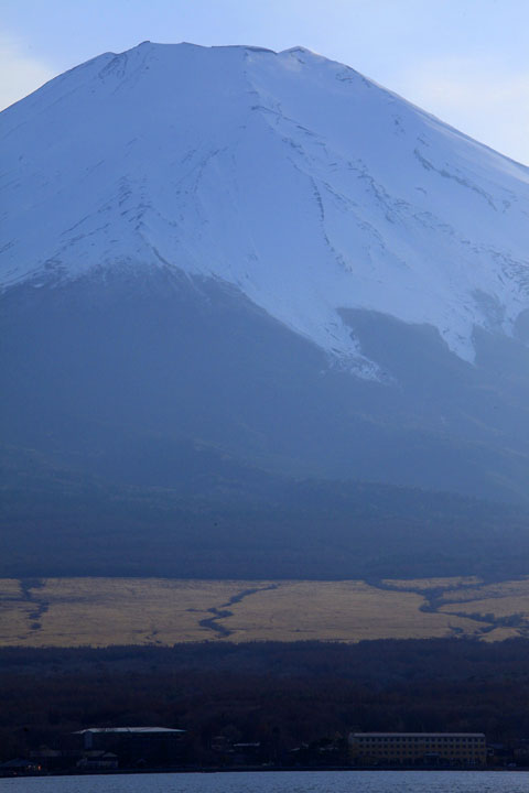あまりの巨大な霊峰に、写真をみたとき唖然とした。富士山って遠くから見る事が多いので、気づかなかったが、やっぱり日本一の山だ。下に広がるススキの草原だろうか、草原や建物の大きさと山を見比べてほしい。すごいスケールだ。