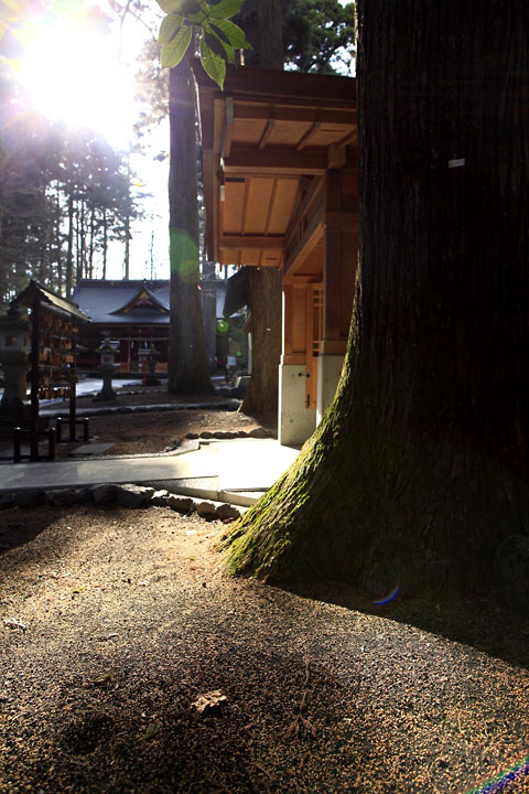 神社の境内には苔むした木々がとても似合う。またうっとそうとした森の中にある事が多いので、こうした木々の木漏れ日がまた似合う。パワースポットで有名な北口浅間神社の境内にて、至極の光を味わう。