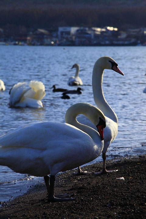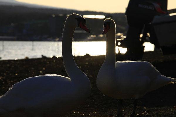 夫婦の白鳥でしょうか。お互い見つめ合ったまま、動きません。何を会話しているのでしょうか。気になるところです。時折、周りに聞こえないほどの小さく声をあげているのがわかりました。首の後ろに逆光を浴びていて、なんとも印象的な一枚となりました。