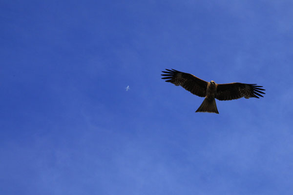 キュ〜〜 鳴き声が空にこだまして行きました。秋晴れの今日、冨士を望む湖畔、青空を舞って行く鳥は優雅で思わず車を横にとめ、シャッターを切りました。