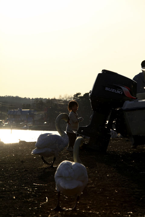 白鳥達も子供だとわかってるのでしょうか、特におびえる様子もなく、淡々と毛繕いをしています。砂埃に光があたって、まるでダイアモンドダストのよう。