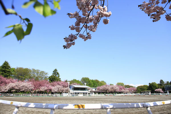 さくらと優雅に走る白馬、、心地よい風が吹き抜ける。さわやかなコラボレーション。小さく土煙をたてながら目の前を駆け抜ける。ふと白馬と目が合った気がした。うるうるとした黒い瞳にノックアウトだ。
