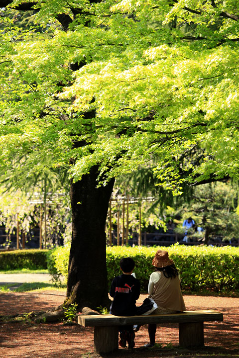 こうして何気ない寄り添う時間が大切。子供心に意外にこうした時間が記憶として残っているものだ。新緑がまぶしい季節の入口に入ってきました。新学期を迎えて子供も意外に忙しい季節。やさしく若葉とそよ風が二人を包み込みます。微笑ましい光景です。