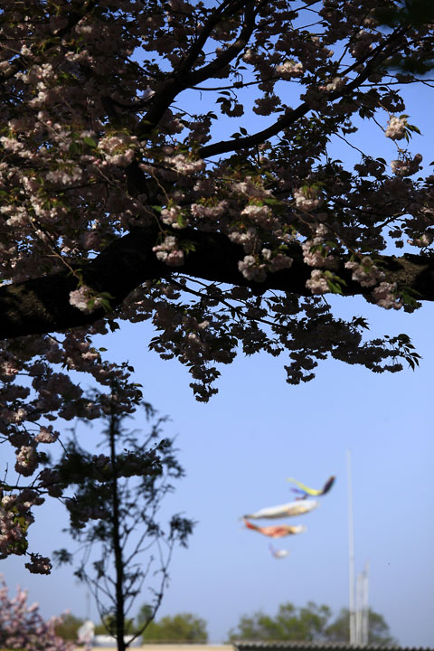 そうそう普通の桜は4月上旬ではかなくも散ってしまいますが、八重桜は違います。4月いっぱいまでは咲き誇る事が多いようです。となると、、、鯉のぼりの季節が近づいてきます。遠くに翻る鯉のぼりと桜。季節のバトンタッチがおこなわれていきます。