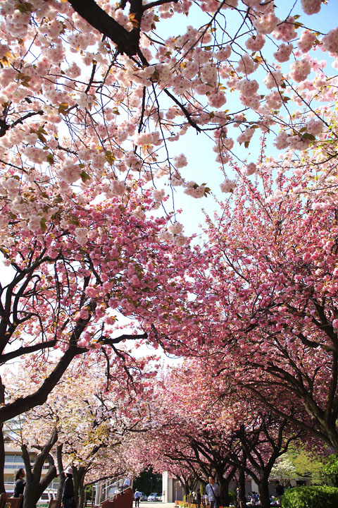 八重桜のトンネル。えも言われぬ美しさとやさしい色会いに包まれて、散歩する時間は至福の時間です。