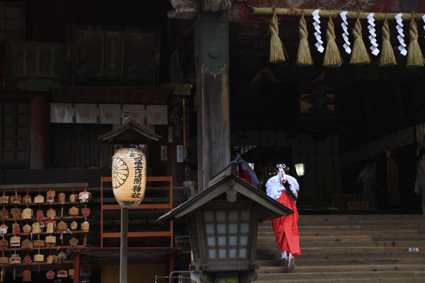 趣のある、長年の風雪に耐えてきた社殿の柱は、より一層風情を感じさせる重厚さを備えていた。白いと深紅の袴の巫女さんだろうか、おつとめに社殿に向かっているところだった。そのグレーシュな世界の中に、その色合いが美しく映えていた