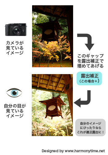 青い矢印にあるように、カメラが判断した適正露出に対して、人が自ら、露出をプラス、マイナス補正する事で、「人による適正露出」を得る事ができるのです。